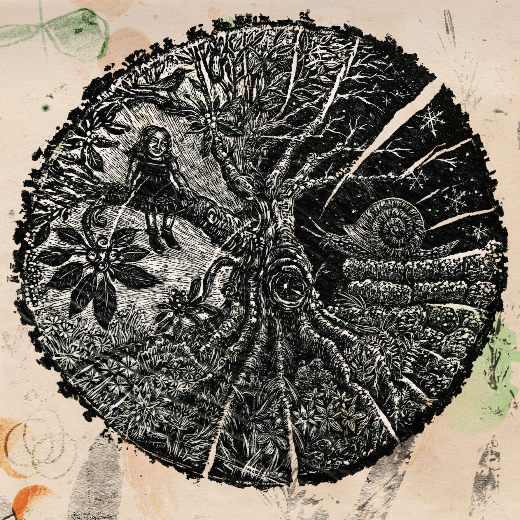 Black and white illustration of a girl sitting on a tree branch at night, surrounded by detailed plants, a large snail, and stars, all within a circular border, evoking a dreamy theatre scene on a textured background.