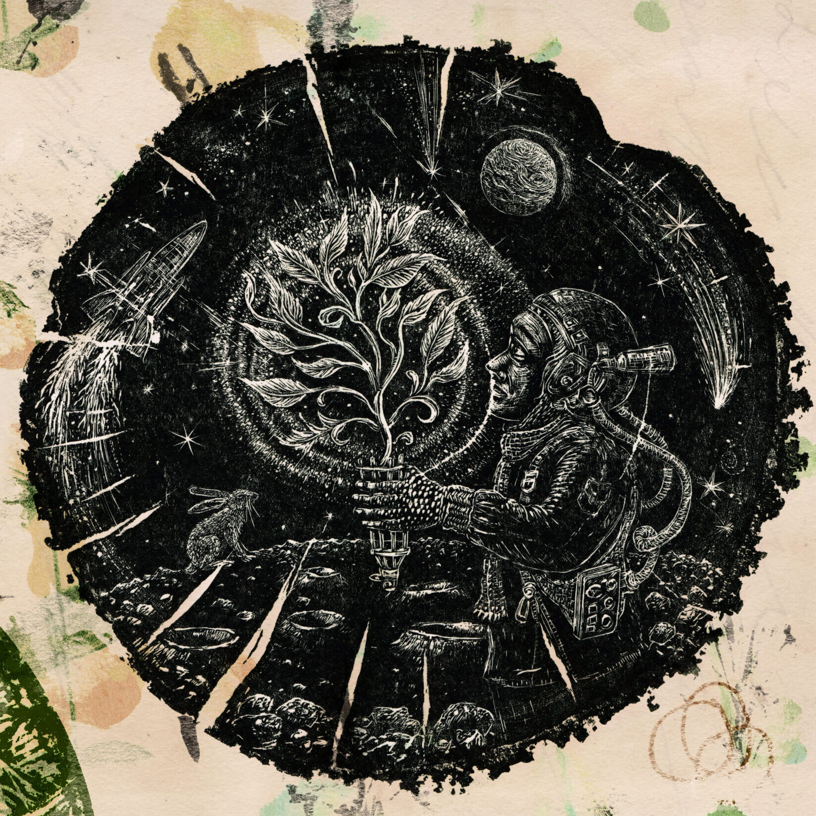 A textured illustration shows an astronaut nurturing a glowing Tree of Light inside a circle. The background features abstract earthy tones, stars, a planet, and outer space elements, blending nature and cosmic themes.