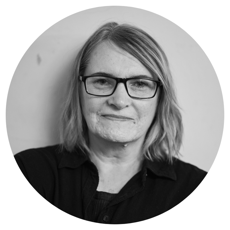 A woman with shoulder-length hair wearing glasses and a dark top looks directly at the camera with a slight smile, posed against a plain light background.