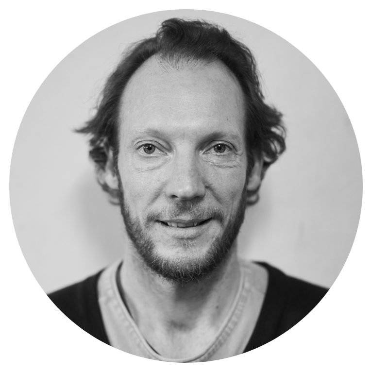 Black and white portrait of Nathan O’Keefe, a man with short, wavy hair and a beard, wearing a casual shirt and sweater. He looks directly at the camera with a slight smile; the background is plain and softly blurred.